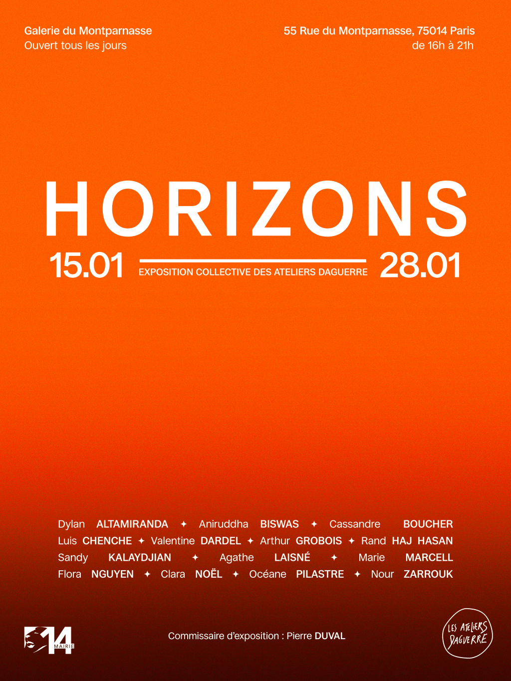 Pour cette nouvelle exposition des résidents des Ateliers Daguerre, intitulée Horizons et présentée à la Galerie du Montparnasse, le commissaire invité Pierre Duval propose une mise en regard des pratiques des artistes : Dylan Altamiranda, Aniruddha Biswas, Cassandre Boucher, Luis Chenche, Valentine Dardel, Arthur Grosbois, Rand Haj Hasan, Sandy Kalaydjian, Agathe Laisné, Marie Marcell, Flora Nguyen, Clara Noël, Océane Pilastre et Nour Zarrouk.